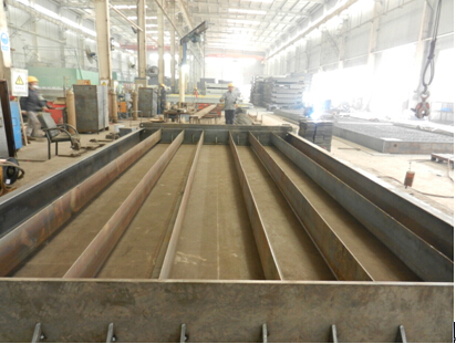將秤體吊出平臺,依次將槽鋼、角鋼、筋板、焊接端頭組件上,并按圖紙要求保證焊縫高度。焊后清渣。