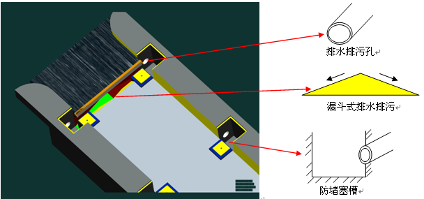 秤體頭尾部分與引道縫合不好,會(huì)形成一定縫隙。塵土、垃圾會(huì)通過(guò)縫隙落入秤體底部。同時(shí),污水也會(huì)通過(guò)縫隙流入秤體底部,若秤體底部排泄設(shè)施未處理好,將造成稱重傳感器被污水侵泡,直接影響產(chǎn)品質(zhì)量。針對(duì)此特殊環(huán)境,充分考慮了排泄措施,免除了將秤體吊起清污排水的麻煩。(如下圖)