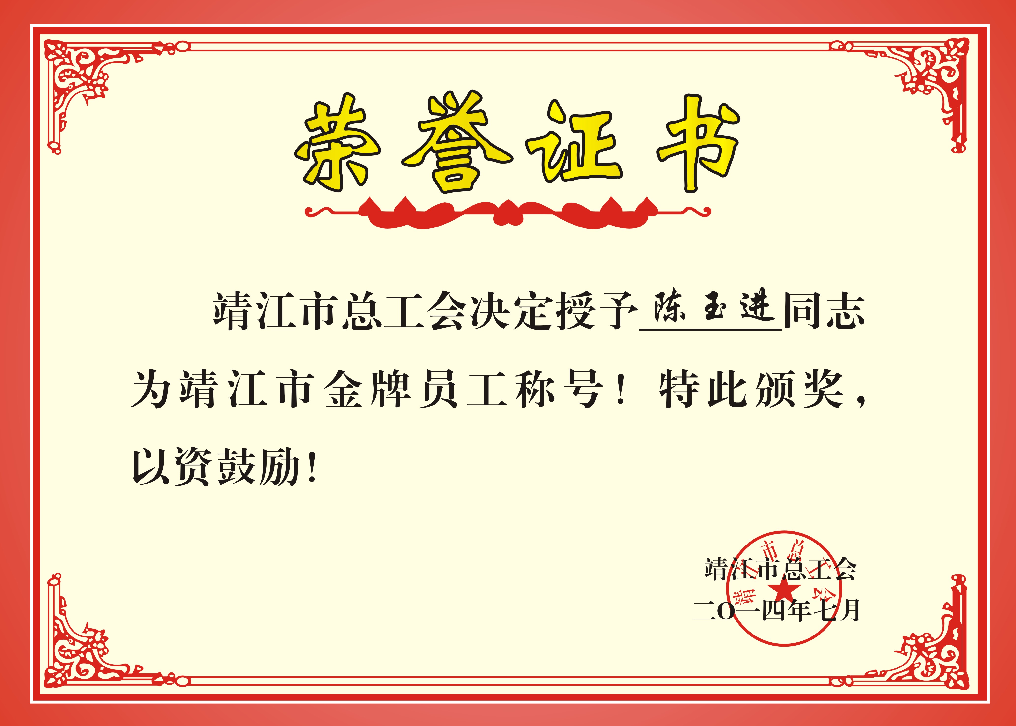 陳玉進同志在衡器行業從事18年,2001年進入江蘇長江衡器有限公司,進入公司后,對地磅安裝調試等技術的自學與鉆研,在2014年7月由靖江市總工會舉行的技能大賽上奪冠,獲得“靖江金牌員工”稱號。