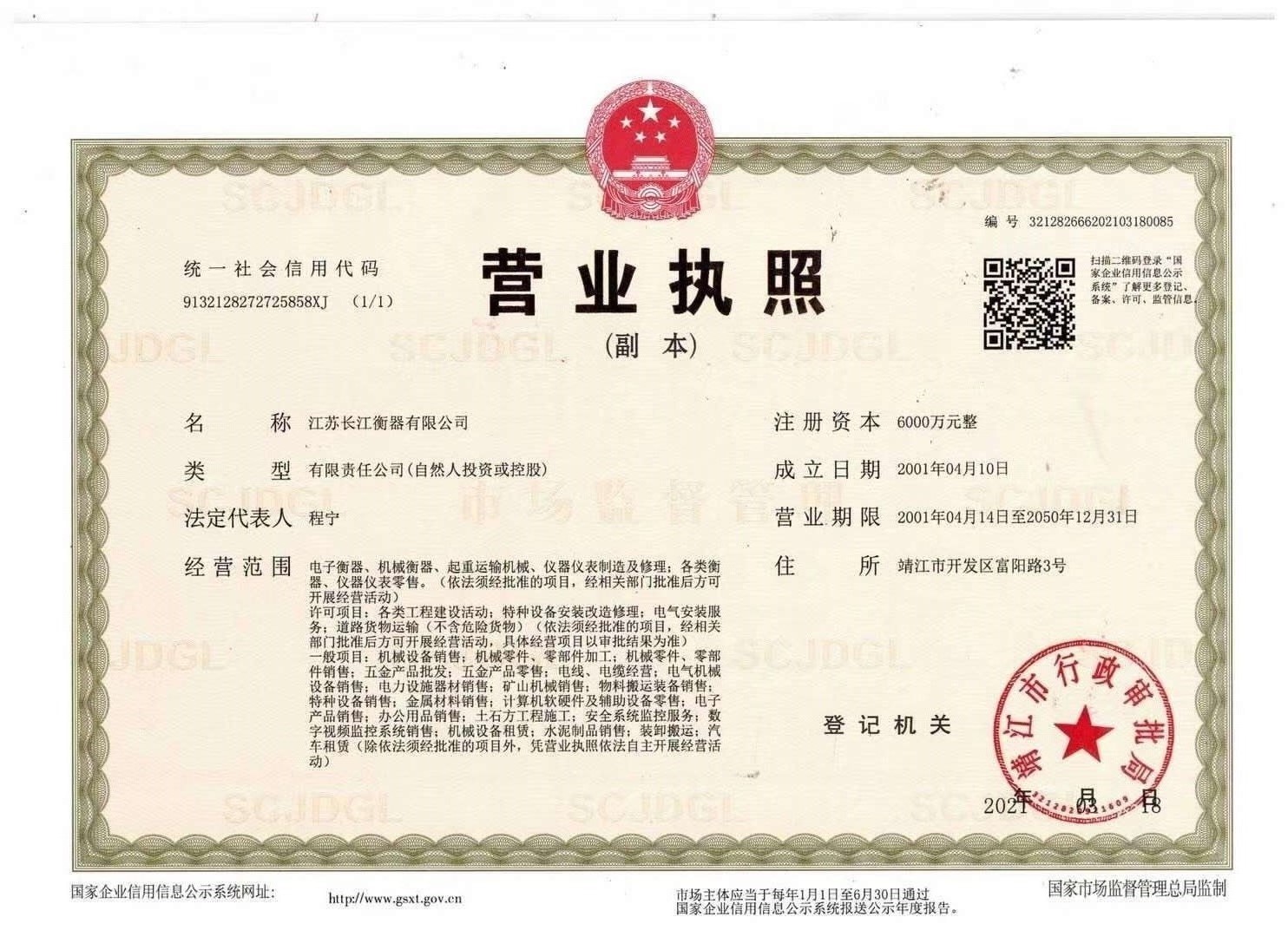 江蘇長江衡器營業執照
