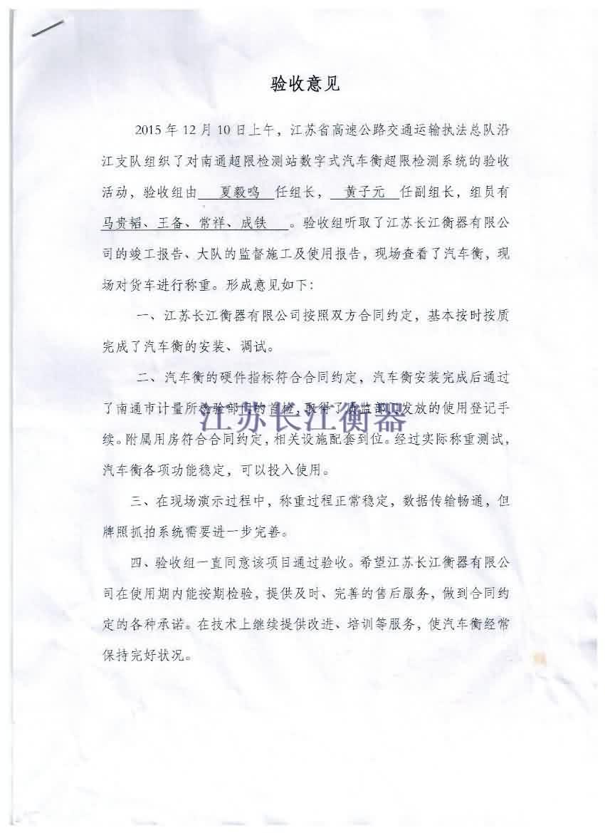 江蘇省高速公路交通執法總隊之南通超限檢測站數字式汽車衡驗收通過