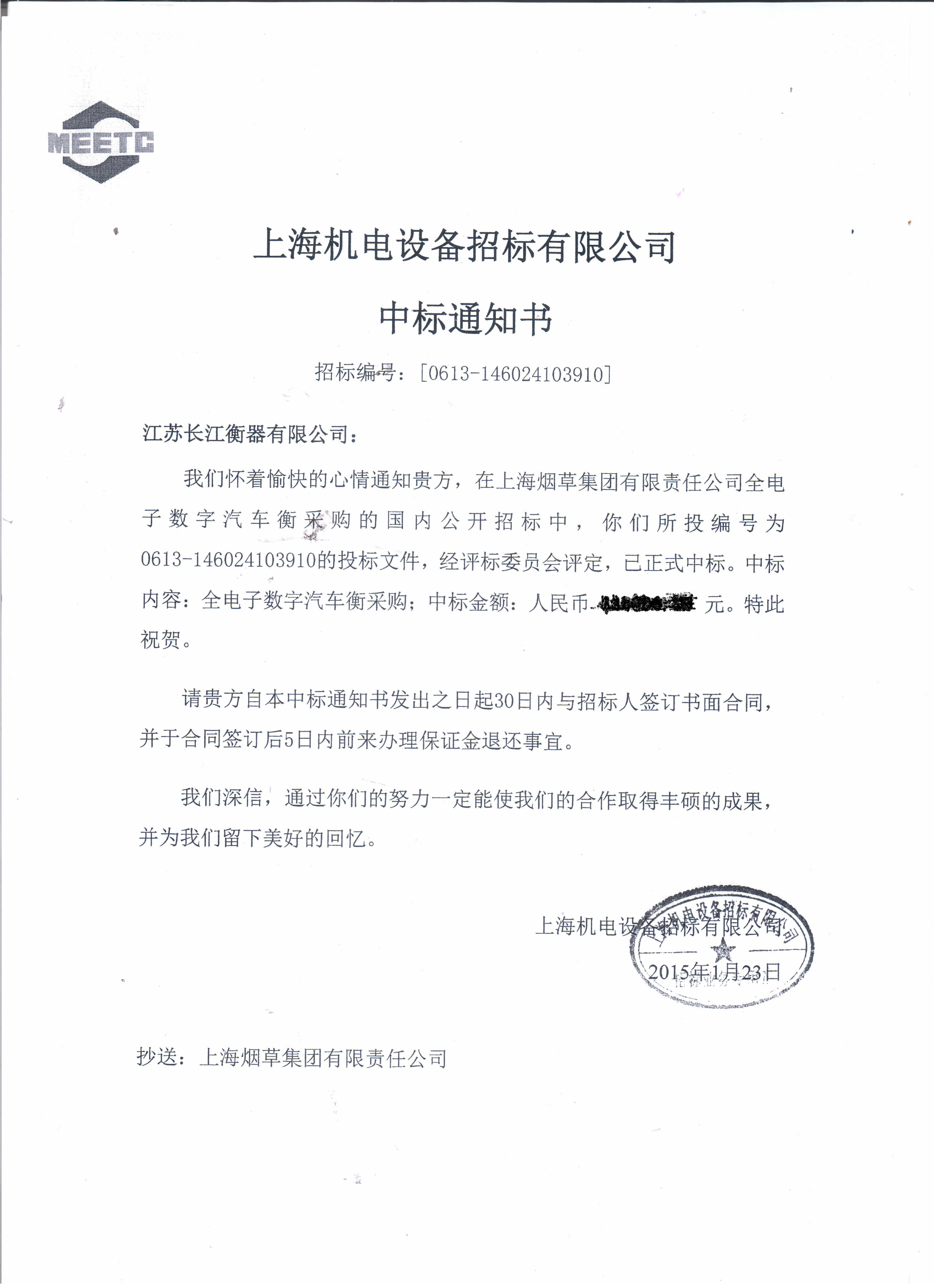 我公司參加上海機電設備招標有限公司招標中,就上海煙草集團有限責任公司全電子數字汽車衡采購的國內公司招標中,我公司中標!