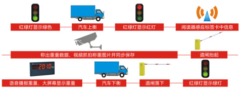 流程:紅綠燈顯示綠色——汽車上衡——紅綠燈顯示紅燈——閱讀器感應(yīng)標簽卡中信息——稱出重量數(shù)據(jù)、視頻抓拍稱重圖片并同步保存——道閘抬起——語音播報重量、大屏幕顯示重量——汽車下衡——道閘落下——紅綠燈顯示綠燈