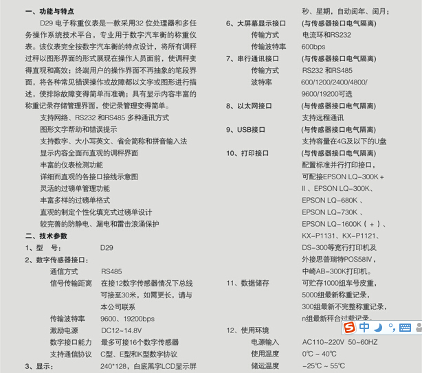 10)數據通訊功能,可配接計算機稱重系統,可邊接大屏幕顯示器和打印機;